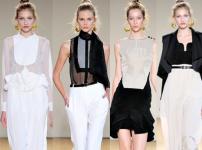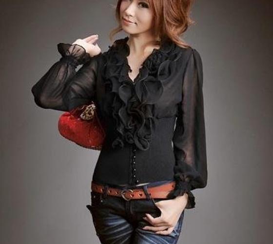 Одной из самых стильных тенденций этого сезона является ретро мода, под влиянием которой создаются закрытые блузки «под горло» черного цвета. Изящный манжет подчеркнет все прелести фасона, а пуговицы-стразы облагородят обыденность черного цвета. Да здравствует шифон! Легкость, элегантность и женственность снова на пике модного Олимпа.