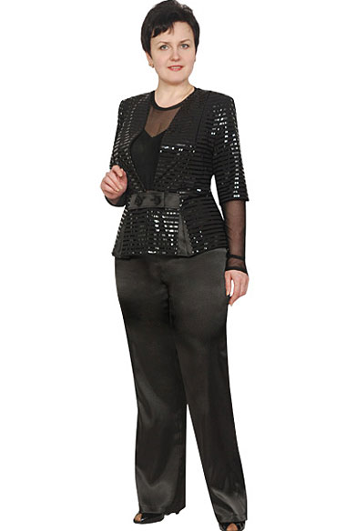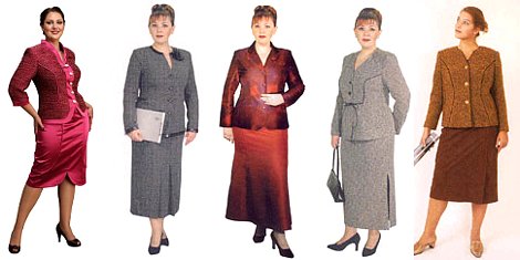 Специально для полных и стильных женщин – несколько вариантов модных сочетаний вещей,способных скрыть лишние килограммы(см. на фото костюмы для полных девушек):