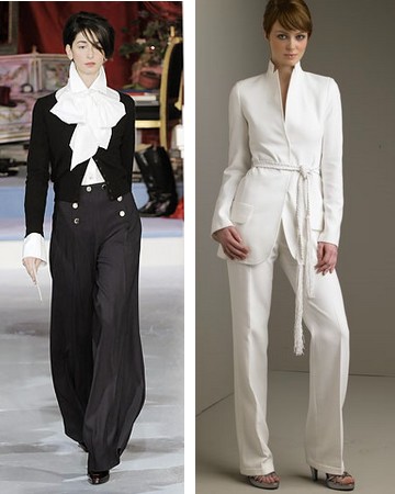 Несколько более удачную попытку интерпретации мужского стиля можно пронаблюдать в коллекции Ralph Lauren. Строгий крой костюма и черный цвет все же не затмевают прекрасного женского естества, в первую очередь это достигается благодаря наличию яркой обуви на каблуке, лоснящейся ткани и приталенным жакетам.