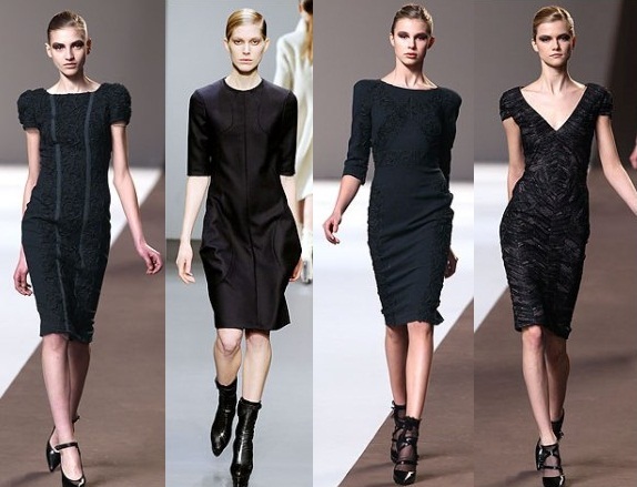 Все дело в аксессуарах! Практически все модные дома в своих коллекциях представили черные деловые платья 2013. Все они сделаны из тяжелых матовых тканей глубокого черного цвета, простого кроя с минимумом декора. Встречаются драпировки, воланы, реже гипюр. Длина – умеренная, до колена, нижняя часть – зауженная, иногда легкий клеш.