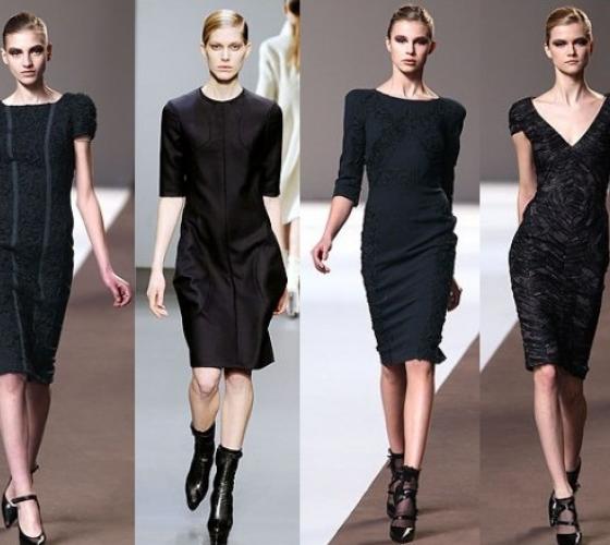 Платья для деловых встреч никогда не выйдут из моды, а уж тем более из женского делового гардероба. Эта та уникальная вещь, которая всегда уместна: утром – в офисе или на деловой встрече, вечером – на коктейле или свидании. Все дело в аксессуарах! Практически все модные дома в своих коллекциях представили черные деловые платья 2013(см. фото). Все они сделаны из тяжелых матовых тканей глубокого черного цвета, простого кроя с минимумом декора. Встречаются драпировки, воланы, реже гипюр. Длина – умеренная, до колена, нижняя часть – зауженная, иногда легкий клеш