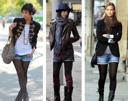 Для ранней осени подойдет такое сочетание: джинсовые шорты и куртка, плотные черные колготы, вязаный свитер и высокие сапоги. С этим ансамблем будет хорошо смотреться кепка квадратной формы и сумка через плечо. Маленький нюанс, куртка и шорты не должны быть комплектом, сейчас это не модно. Пусть они отличаются по цвет, оттенку, фактуре ткани – вот тогда ваш образ будет стильным.