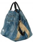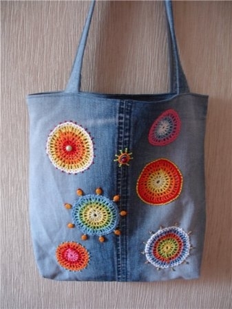 Горизонтальная торба отличается тем, что пришиваем два круга, а в штанину на всю длину вшиваем молнию и приделываем лямки с боков. Помните, у нас остались шорты? Можно отпороть карманы и также пришить их по бокам. А если в процессе носки джинсов в них образовались дырки - используйте разноцветные заплатки. Ну вот, Ваша джинсовая сумка готова!