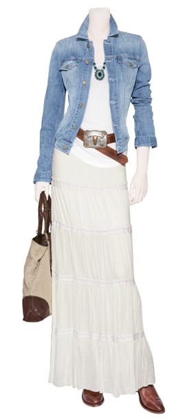 Трикотажная майка в сочетании с макси-юбкой, как цветной, так и однотонной или платье в мелкий цветочек, ну и конечно же джинсовая куртка – вот сегодняшний хит в одежде не только множества американцев, даже голливудские звезды «признали» за такой одеждой право на существование.