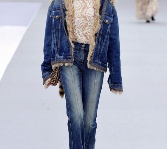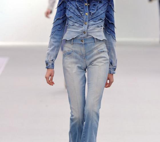 В моде остаются как однотонные джинсы без потертостей, так и модели с нарочито вытертыми местами. Так, например, Роберто Кавалли предлагает модницам обратить свое внимание на светло-голубые однотонные джинсы, в то время как Dsquared? советуют выбирать брюки-дудочки из синего или темно-синего денима с искусственными потертостями и разрезами.