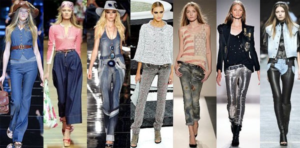 Неизменным фаворитом по-прежнему остаются джинсы-скинни, плотно обтягивающие стройные ножки модниц как в коллекциях от Calvin Klein и D&G. Не менее актуальными фасонами становятся джинсы-галифе, джинсы-бананы, которые расширены в бедрах и зрительно сужены книзу, укороченные модели и подвернутые джинсы. Так, в коллекции от Isabel Marant можно встретить джинсы как с подвернутыми, так и с укороченными штанинами, а вот бренд Dsquared? отдал предпочтение зауженным джинсам, выполненным в ковбойском стиле.