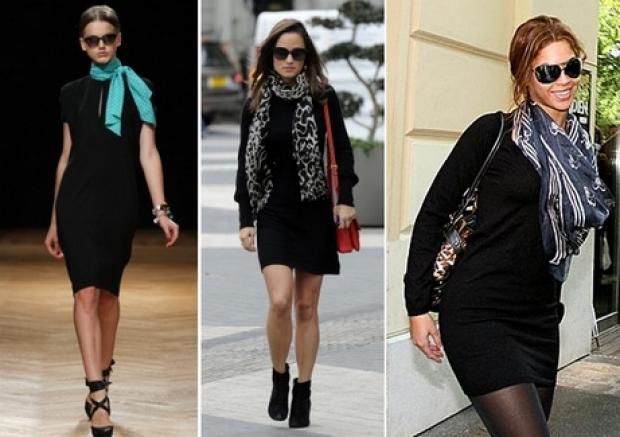 Даже весьма строгое черное платье благодаря такому дополнению приобретет налет легкомысленности и станет вполне повседневным, вписывающимся в так называемый городской стиль. Дополнить этот комплект можно плотными черными колготками и/или яркими по цвету туфлями (они могут либо сочетаться с шарфом, либо «солировать» в этом ансамбле).