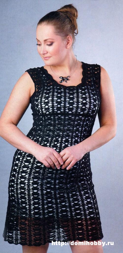 Платье вяжется по кругу. Свяжите цепочку из 216 возд. п., замкните ее в круг и свяжите 2 ряда ст. 6/н. Затем равномерно распределите 18 раппортов узора по схеме и вяжите по кругу на высоту 5 узоров (11 см). Затем на высоте 11 см разделите вязание пополам и продолжите вязание спинки и переда раздельно. На передней полочке для пройм рукавов оставьте с обеих сторон по одному раппорту, одновременно с убавками для проймы закройте для выреза горловины 3 центральных раппорта и продолжите вязание раздельно на двух раппортах до высоты 14 рисунков. На задней полочке выполните убавки для пройм аналогично переду и провяжите еще два рисунка в высоту, на высоте 7 узоров (17 см) закройте для выреза горловины 3 центральных раппорта и продолжите вязание раздельно на двух раппортах до высоты 14 рисунков.