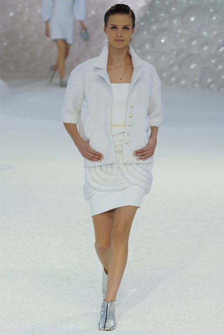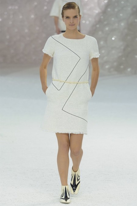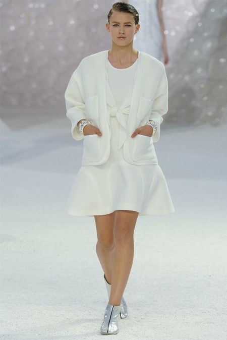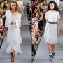 Короткие коктейльные платья в игривом стиле baby-doll были обрамлены традиционными «шанелевскими» твидовыми жакетами. В качестве декора Карл Лагерфельд выбрал цепи, жемчуг и плиссировку. А тонкие геометрические принты придали изящества лилейным убранствам.