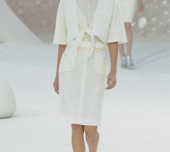 Морской тематикой вдохновились два модных дома: Versace и Chanel. Большинство белоснежных убранств первого украсили морские коньки, ракушки и звезды, а также золотистые клепки и стразы. Модели вышагивали в нежных платьях, дополненных такими же светлыми босоножками, платформа которых была прозрачной.