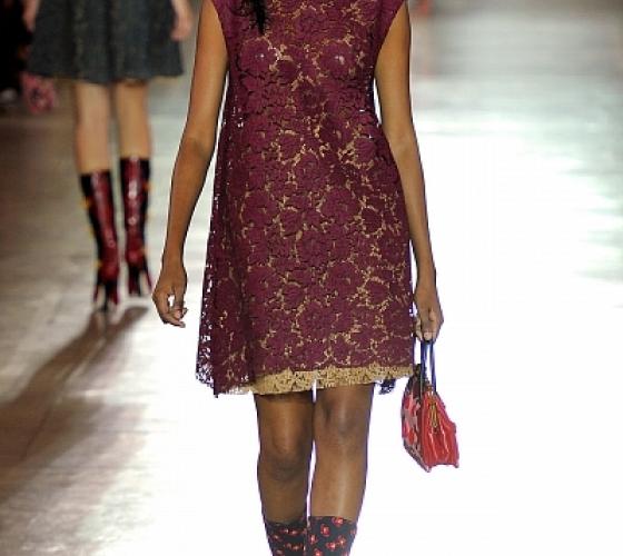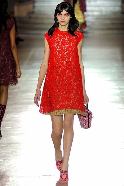Коллекция Miu Miu не отличается богатством мини платьев, однако три восхитительных трапециевидных платья красного, бордового и синего цветов, выполненных из кружева, просто поражают воображение.