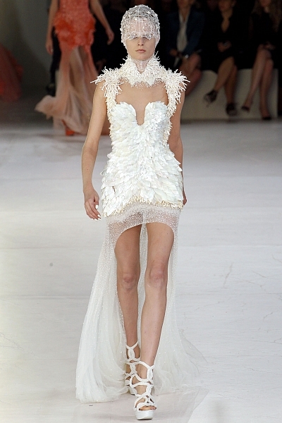 В центре внимания маленькое кукольное платье с богато расшитым стразами верхом и преувеличенно пышным, порой рваным низом. Основные цвета – пастельные, лишь одно платье приковывает взгляд кроваво красным цветом. Актуальны платья с асимметричной длиной подола. В этой коллекции они выполнены из прозрачной ткани, отделанной кружевом и перьями.