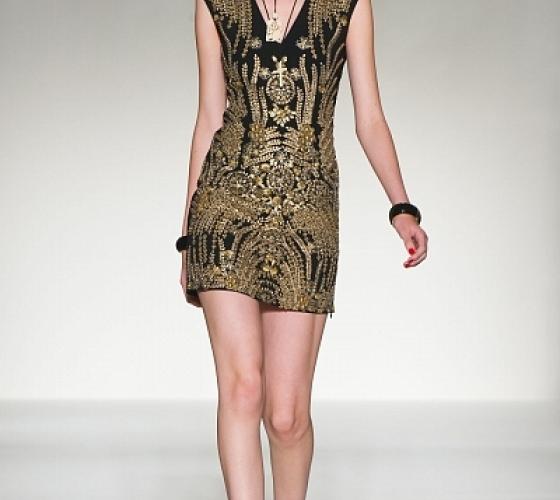 Дизайнеры дома Balmain не изменяют своему стилю. В коллекции представлено большое количество обтягивающих фигуру ультракоротких платьев. Дизайнеры отдали предпочтение сочетанию золотого с белым и черного с белым, порой стразы покрывают практически всю поверхность платья.