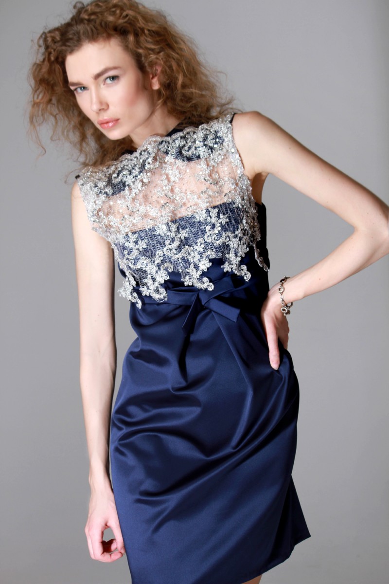 Оригинально будет смотреться и синее платье «а ля школьница». Если оно будет декорировано белоснежным кружевом, то приобретет по-настоящему праздничный вид. Такая модель представлена в последних модных коллекциях, так что встретить будущий Новый год в подобном платье — значит, угадать самое актуальное направление.
