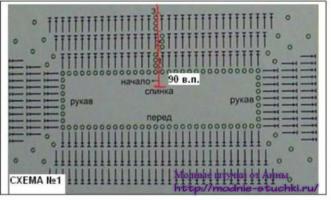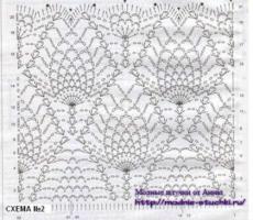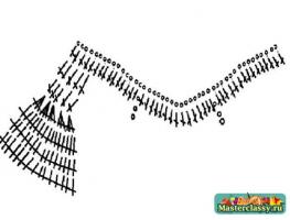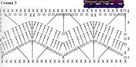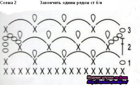 Далее вяжите юбку по схеме 2, расширяя ее к низу за счет увеличения вп между “веерами”. По низу юбки выполните обвязку ст б/н.