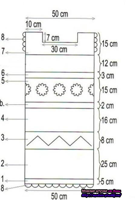 Закончим работу, довязав изделие по схеме 7. В этом участке нам необходимо сделать горловину выреза, шириной 30 см, и продолжить вязать с обеих сторон бретели, шириной 10 см и высотой 7 см каждая.