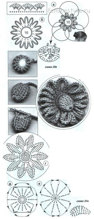 Шаг шестой. Пришиваем на платье маленькие розовые цветочки из органзы а также вывязанные крючком, по нижеуказанной схеме, украшаем их бусинами и заканчиваем работу.