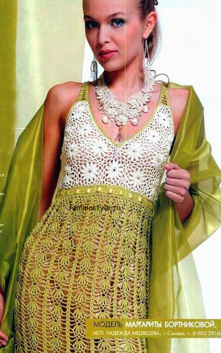 Вязание платья молочно-салатового цвета выполнено крючком.
