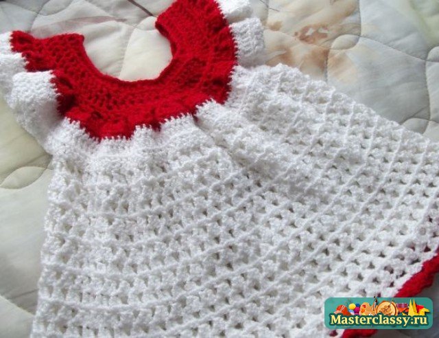 В принципе платье уже готово, осталось только украсить или обвязать его оборкой. Сделаем мы это контрастной пряжей – красного цвета. Какую именно оборку выполнить решать вам, можно просто вывязать из каждой по 2 ст. с/н. Ну и все – платье для маленькой принцессы готово!