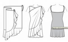 Дополнительно переснять обтачку верха платья шириной 3 см в готовом виде. Дополнительно выкроить: шлевку для драпирующейся детали шириной 10 см ( в готовом виде 5 см) и длиной 15 см. (один конец шлевки накладывается на талевый срез платья под деталью драпировки, второй конец прегибается поверх драпирующейся детали и накладывается сверху).