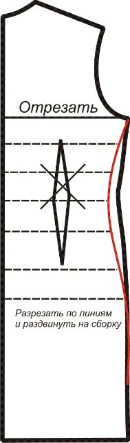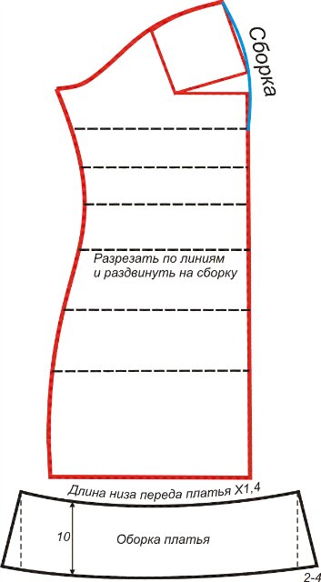 Разрезать выкройку переда платья по горизонтальным пунктирным линиям и раздвинуть на 2-3см на сборку.