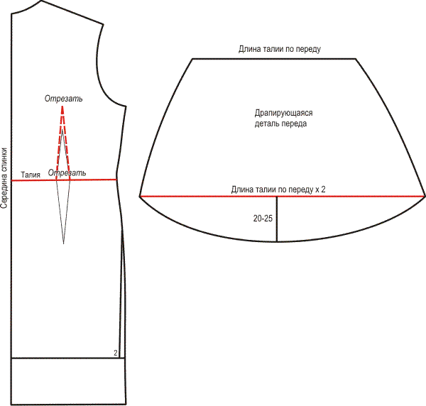 Дополнительно построить драпирующуюся деталь платья. Для этого необходимо измерить длину по линии талии переда платья. Отложить это значение по линии.