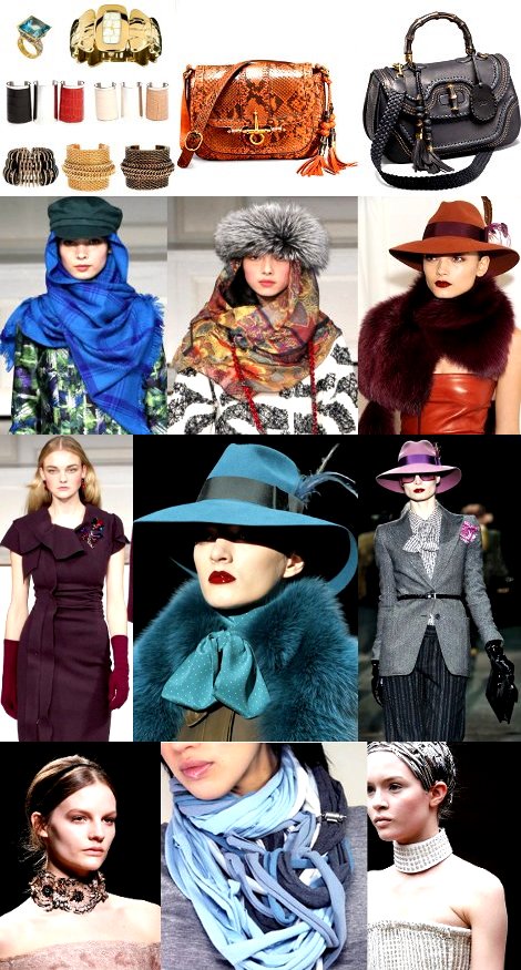Роскошный мех господствует в аксессуарах зимой 2012 года: из него изготавливаются модные головные уборы, боа, горжетки, сумки. В коллекции от Gucci эти вещи просто великолепны! В моде – разнообразные меховые шапки, как в коллекции Oscar de la Renta, причем предлагается их носить поверх головного платка.