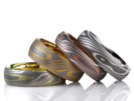 Сейчас техника широко используется в ювелирном деле – такие кольца, браслеты, серьги, запонки очень ценятся и по вполне понятным причинам являются особым шиком, дорогим и эксклюзивным. Популярнее всего обручальные кольца «мокумэ ганэ» — можно заказать пару колец, которая будет единственной в мире – количество сочетаний металлов немалое, да и узор повторить непросто.