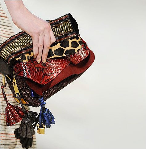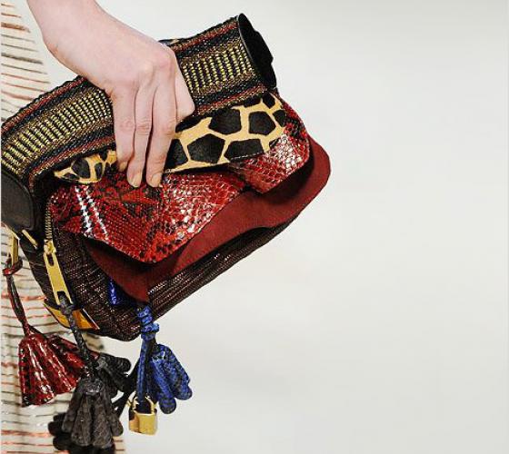 Сложные конструкции сумок коллекции, вдохновленные племенными узорами и гламуром рок-звезд, насыщены интересными, почти уникальными элементами. Большинство из них имеют небольшие размеры и выполнены в форме кошельков или клатчей, но есть и достаточно крупные экземпляры.