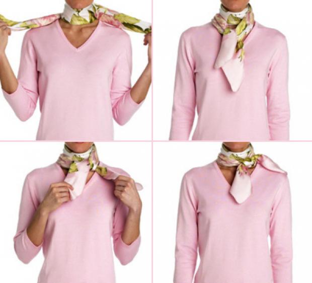 Совет: Если вы хотите скомбинировать платок, завязанный этим способом с блузкой с воротничком, следует расположить узел по центру.
