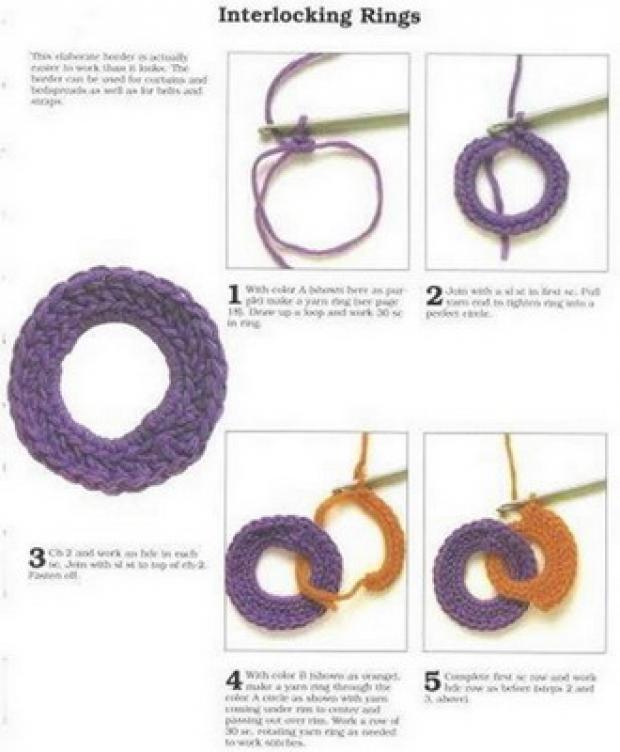 4. Вывязав первое кольцо, приступают к вывязыванию следующего. Нить основы обвивают вокруг первого кольца и замыкают. По тому же принципу, что и первое кольцо, вывязывают следующее звено шарфа-цепочки