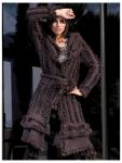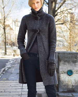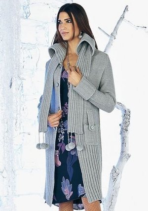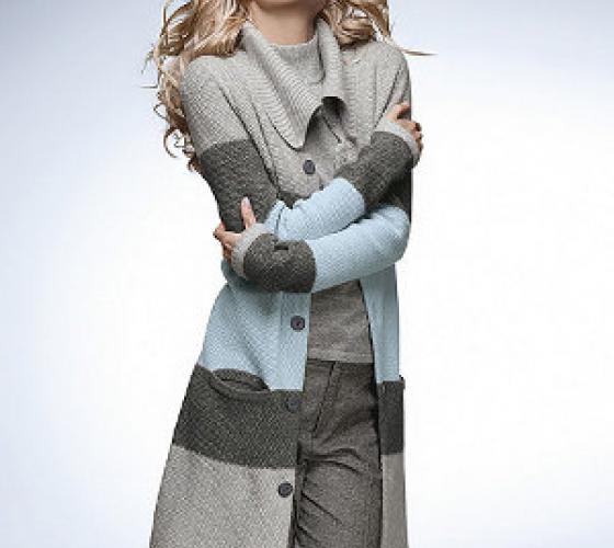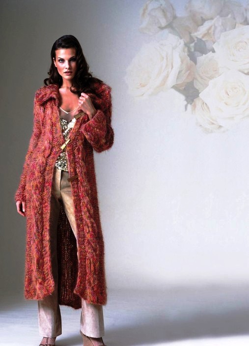 Такое вязаное пальто выполняется в классической цветовой гамме, используются черный, коричневый, синий, дымчатый и песочные оттенки. Писком моды является украшение крупной ручной вязкой, применять можно любые рисунки, от хорошо известных косичек и широких полос, до таких изощрений как дреды и вязаный мех.
