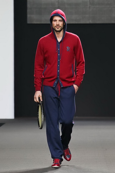 Элегантные мужчины начали представление с классических аристократичных костюмов в итальянском стиле и фраков с цилиндрами, плавно показ перешел на демонстрацию спортивной и сasual одежды. В честь перекрестного года Италии-России Стефано на толстовках вокруг брендового логотипа добавил надпись «Italia и Russia». Мужчина с сигарой