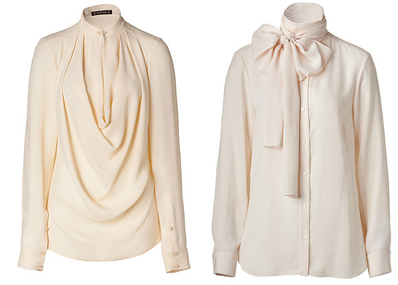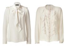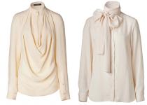 Защипы, рюши, воланы, банты, широкие рукава на манжетах – все это элементы модной блузки. Белые блузки в этом сезоне иногда могут иметь легкий молочный или другой оттенок, но в целом иметь образ белой блузки. Часто встречаются стойки, которые впереди украшаются большим завязывающимся бантом. Любой декор на груди или рукавах также приветствуется.