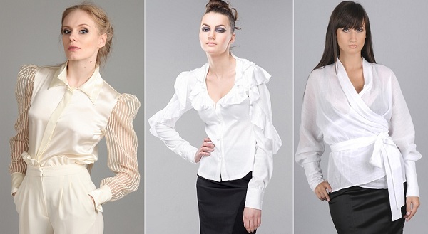 Белая блузка в классическом стиле идеально сочетается с чёрными широкими или классическими брюками. Как офисный вариант великолепно смотрится фасон с рукавами «фонарики» в комбинации с платьем-футляр или строгим сарафаном на широких бретелях.