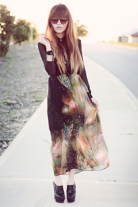 Хороший наряд для хипстеров. Очки, какое-то платье а-ля ковер, многослойность, тяжелый низ. Нет, мне честно очень нравится.