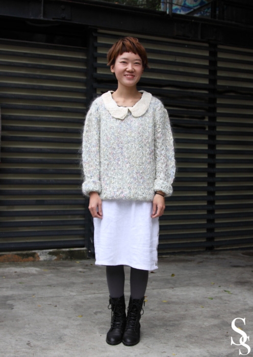 Грамотное сочетание теплого верха и легкого низа. Шикарное сочетание цветов — небесно голубого и нежно-персикового. Отличные аксессуары, сумка, мэйк. Я не знаю, к чему придраться. Это идеальная эклектичность.