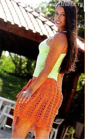 Для начала сделайте выкройку по вашим размерам. Юбку начинайте вязать от пояса по кругу вниз узором «ракушка». Закончите вязать тогда, когда длина парео будет вас устраивать. Затем свяжите поясок и вденьте его в верхнюю часть юбки в промежутках между нитками.