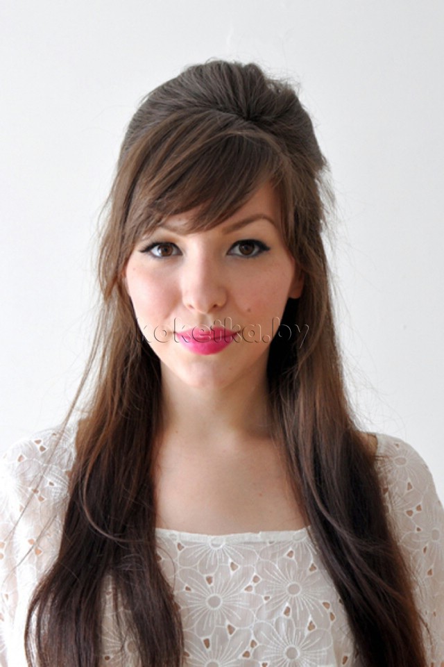 Что касается челки, можно выполнить начес набок. Следует отметить, что так называемая, челка «карлсон» уже давно вышла из моды. Можно сделать прическу с начесом, а челку при этом оставить прямой. Ваш образ будет выглядеть гармоничным.