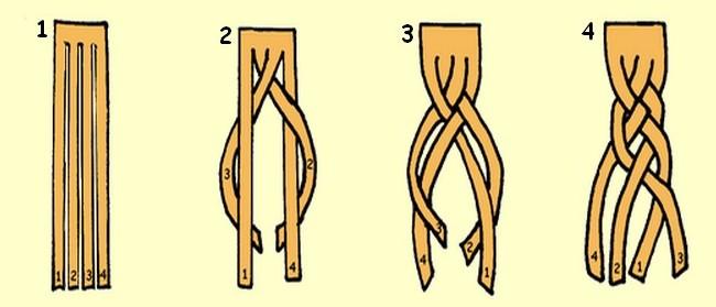6. Прядь под номером один пропустить под вторую, а третью положить на четвертую. Затем первую прядь перекинуть на третью, а вторую – под третью. Продолжать плетение косы до желаемой длины. Кончик затянуть резинкой