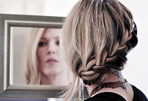 Начните плетение с правой или левой стороны, отделив часть волос над правым (левым) ухом и приступайте к плетению косы в технике колосок. Для этого разделите выбранную часть волос на две пряди и перекрестите их друг с другом (правая прядь над левой). Затем, придерживая правой рукой основное плетение, захватите новую прядь из-под левой пряди и перекрестите ее с правой прядью, наложив сверху. Перейдите на другую сторону, отделите новую прядь из-под правой пряди и наложите ее поверх левой пряди. Продолжайте плетение в том же порядке, каждый раз захватывая новые пряди с левой и с правой стороны. Помните, что пряди должны быть одинаковыми, только тогда прическа получится аккуратной и красивой. Дойдя до противоположного уха, вы можете перейти к плетению обычной косы, которую после завершения закрепляют за ухом при помощи шпилек и невидимок и маскируют распущенными волосами. Сочетание тонкой косички-колоска, идущей по краю головы, и красиво уложенных вьющихся волос будет выглядеть просто великолепно.