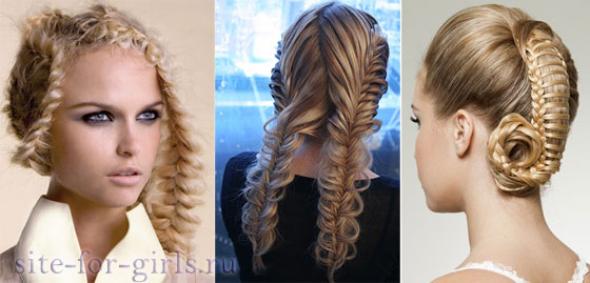 Очень стильная и простая в исполнении — прическа «рыбий хвост». Эта коса названа так благодаря своей внешней схожести со скелетом рыбы. Именно такая косичка бьёт все рекорды по своей популярности. Прическа «рыбий хвост» проста в исполнении и отнимет у вас совсем немного времени. Вы легко справитесь с данным плетением сами, особенно если заплетёте косу набок. Если у вас не слишком густые волосы, можно выпустить несколько прядей, коса будет казаться более объёмной и придаст образу романтичность и женственность. Также Вы можете предварительно завить волосы крупными локонами, а затем уже заплести косы – объем Вам будет обеспечен.