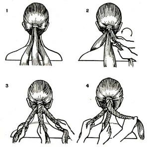 Затем соберите волосы на затылке в хвост и разделите их на три равные части, которые необходимо плотно скрутить в жгуты.