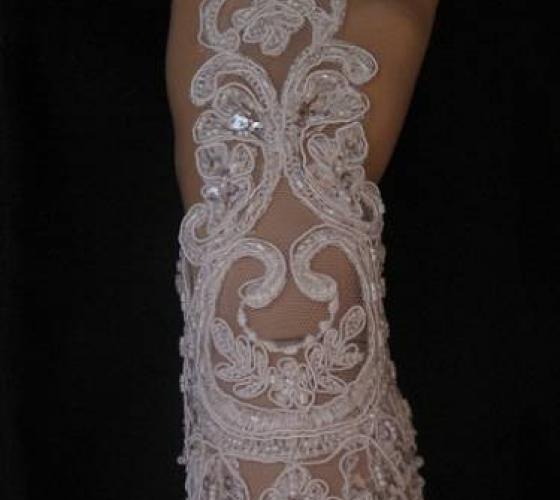 К платьям из шлифованной зеркальной ткани без набивки и рисунка одинаково хорошо подходят и прозрачные кружевные длинные свадебные ПЕРЧАТКИ из гипюра или газа, и непрозрачные лоснящиеся без рисунка. В таком случае лучше подобрать перчатки со стразами и вензелями (монограммой), или дополнить красивой бижутерией – браслетом. Прозрачные белые гипюровые перчатки идеальны, когда гипюровые детали с аналогичным рисунком присутствуют и в самом свадебном платье.