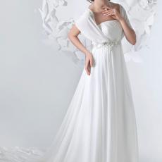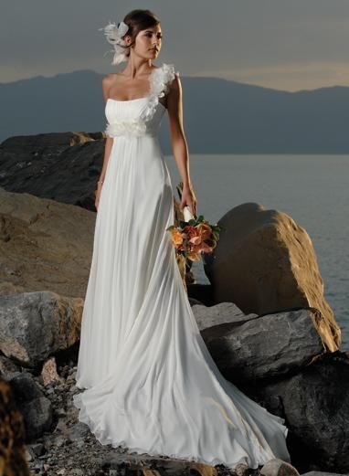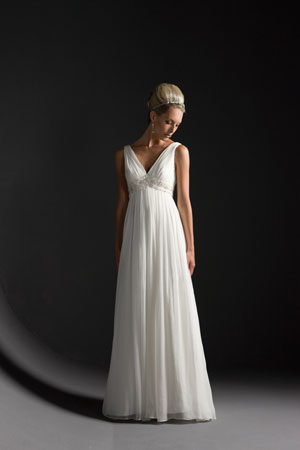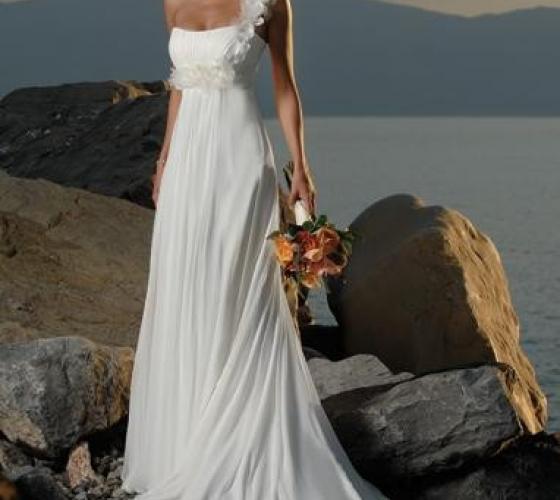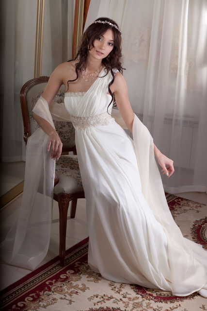 Такой стиль свадебных платьев именуется ампир (см.на фото) или греческий стиль. На сегодняшний день эти свадебные платья пользуются огромной популярностью.