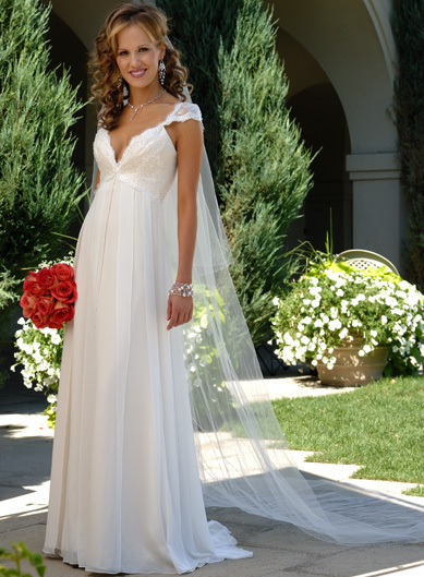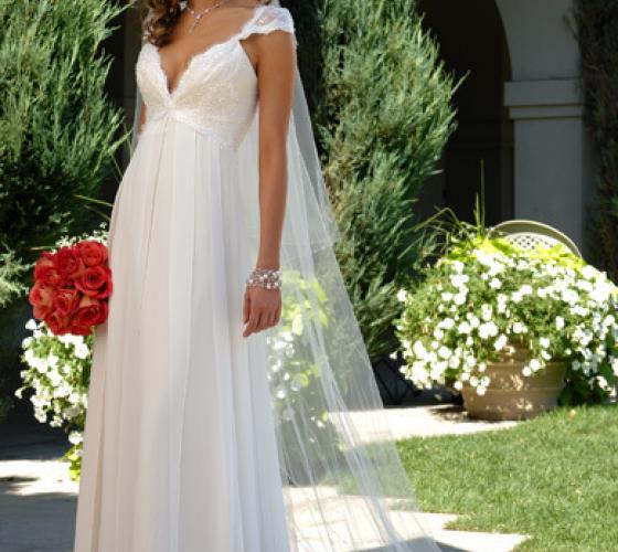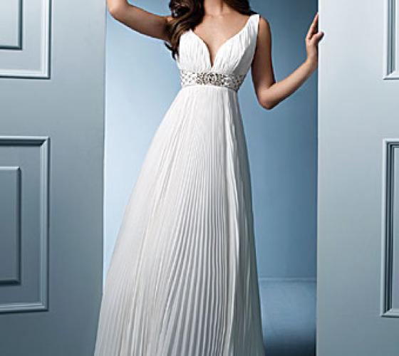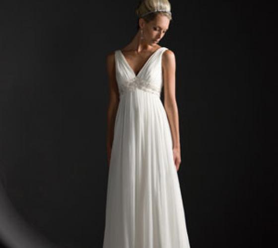 свадебное платье в греческом стилеСвадебные платья в стиле Ампир очень актуальны и в XX веке, который ценит естественность и свободу движения. Деликатный крой делает фигуру стройнее, а мягкие волны ткани скрывают животик.