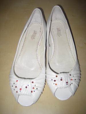Начнем по порядку. Цвет обуви должен совпадать с тоном свадебного платья, или цветом отделки платья. Как правило, это могут быть туфли белого, кремового, жемчужного или розового цвета. В крайнем случае, туфли могут быть на тон светлее платья, но никак не темнее его.