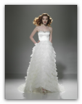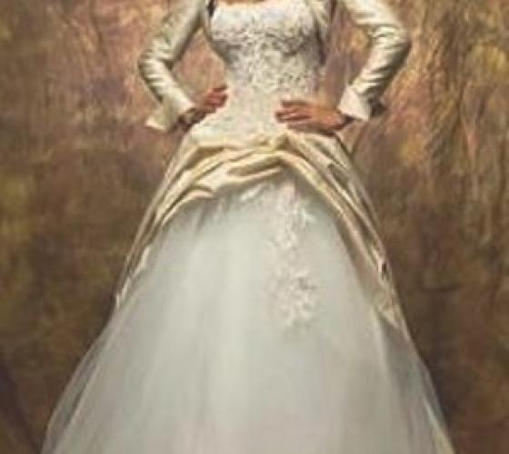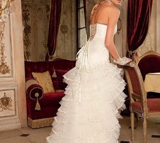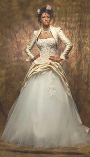 Без болеро эта модель представляет собой роскошное свадебное платье для невесты-принцессы. Сняв шелковый шлейф, невеста превратится в воздушную, легкую и романтичную фею. А аристократичное болеро сделает этот свадебный наряд поистине стильным и элегантным.