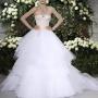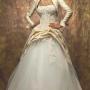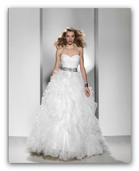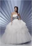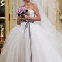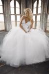 3. Бальное платье – выбор многих девушек. Именно так раньше выглядели девушки на вечерних балах: расшитый бисером плотный корсет, отрезная талия и очень пышная кринолиновая юбка. Многие невесты предпочитают именно такой силуэт платья, потому он придаёт форму бюсту и мгновенно преображает. Для платья используются разнообразные украшения: рюши, ленты, вышивка, банты и даже принт. Смотрится оно нарядно и празднично, дорого и шикарно. Но, к сожалению, на девушках с пышными формами или низким ростом смотрится громоздко. Важным аспектом платья является правильный выбор корсета – максимально подобранный по фигуре, без складок или «обвислостей».