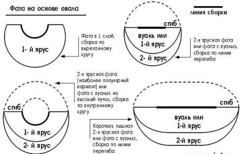 Фата под прическу, к шляпке, диадеме. Такую фату можно сделать с любым числом ярусов по любой из представленных далее схем раскроя, как с вырезом внутреннего круга, так и без него.